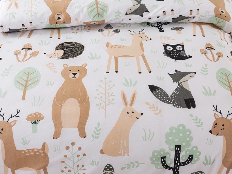 Luxusní povlečení a bavlna renforcé pohladí jemností a lesní motivy obohatí ložnici příjemnou svěží atmosférou. Vzor stromků, jelenů i hříbků na bílé v podkladu je nadčasovou dekorací v podobě povlečení pro moderní interiér ložnice i pokojíku. Kombinací dalších barev v zelené, nebo různých odstínů hnědé můžete zvýraznit vzor na povlečení, a to snadným doplněním polštářků i mikroplyšové deky. Klasický rozměr povlečení na jednu postel snadno povléknete na přikrývku 140x200 a polštář 70x90 cm. Na dotek hladký materiál 100% bavlny je dobře prodyšný, příjemně savý a snadno se udržuje. Bavlněné Renforcé povlečení navíc snese i vyšší teploty praní.