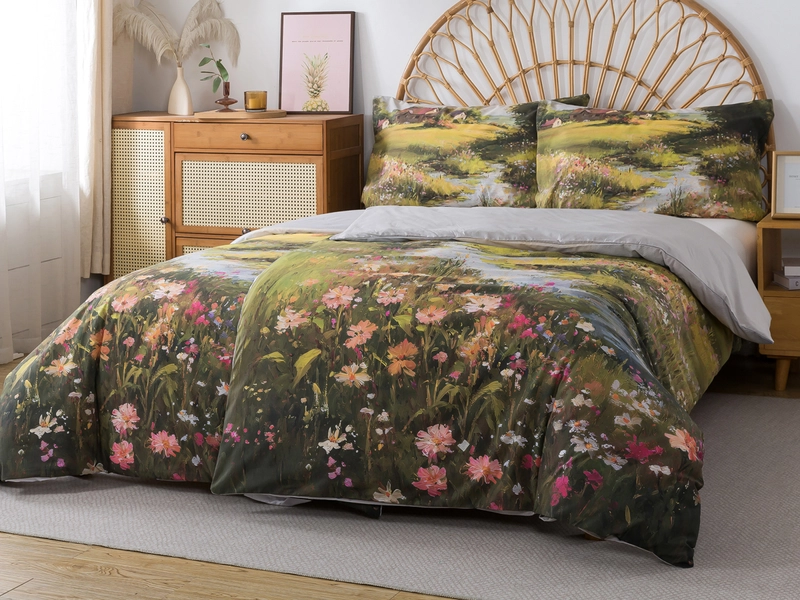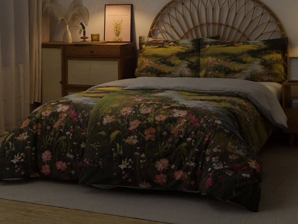 Bavlněné povlečení Letní louka s digitálním potiskem přináší do vaší ložnice klidnou atmosféru venkova a svěží krásu přírody. Jemný motiv rozkvetlé louky doplněný malebnou chaloupkou vytváří harmonickou scenérii, která působí uklidňujícím a romantickým dojmem. Spodní strana přikrývky je jednobarevná - světle šedá. Díky moderní technologii digitálního tisku vynikají barvy vysokou sytostí a detailním zpracováním. Povlečení je vyrobeno z kvalitní 100% bavlny, která je příjemná na dotek, prodyšná a zajišťuje komfortní spánek po celý rok.