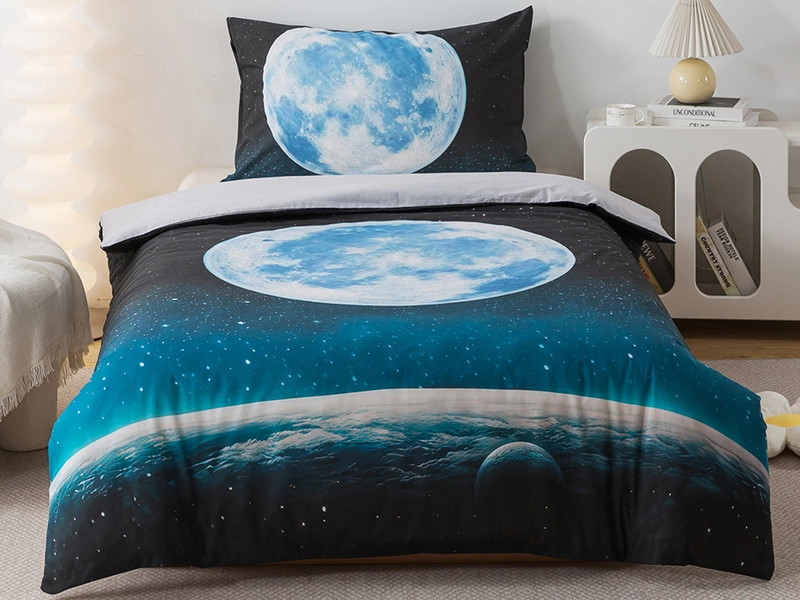 Objevte kouzlo noční oblohy s povlečením NEKONEČNÝ VESMÍR. Digitální tisk hvězd a planet v kombinaci modré - tyrkysové barvy dodá každé místnosti nekonečnou hloubku a uklidňující pocit. Nadchne nejednoho astronoma či nadšence kosmonautiky, a to nejen v dětském pokoji, ale klidně i v pokoji teenagera či v ložnici. Temně modré povlečení s planetami a hvězdnou oblohou uklidní nejen vzorem, ale i kvalitním materiálem z bavlny renforcé. Oceníte na dotek jemný, hladký povrch, vysokou absorpci a odolnost vůči praní. Povlak přikrývky má spodní stranu jednobarevnou - světle šedou, povlak na polštář je s obrázkem z obou stran.