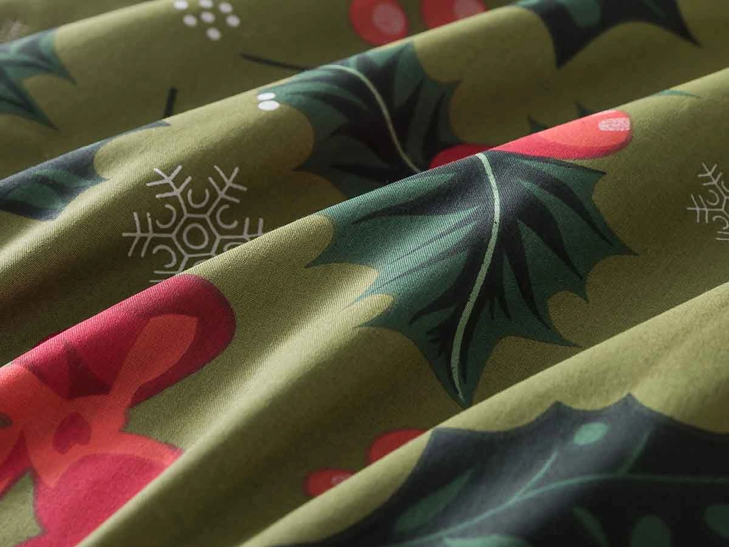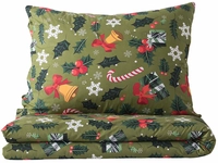 Vánoční povlečení a zelený podklad posetý symboly Vánoc, přinášejí sváteční atmosféru do našich domovů. Olivový odstín zelené barvy zdobí zvonky, cesmína, sněhové vločky a mnoho dalšího, co rozzáří každý interiér. Vánoční vzor v kombinaci s Renforcé bavlnou navodí tu správnou atmosféru pro kvalitní spánek. Samozřejmostí renforcé bavlny je na omak příjemný povrch, savost i vzdušnost a odolnost materiálu vůči častému praní. Při praní můžete klidně zvolit vyšší prací teploty, úprava bavlny renforcé a odolné barvy to vydrží.