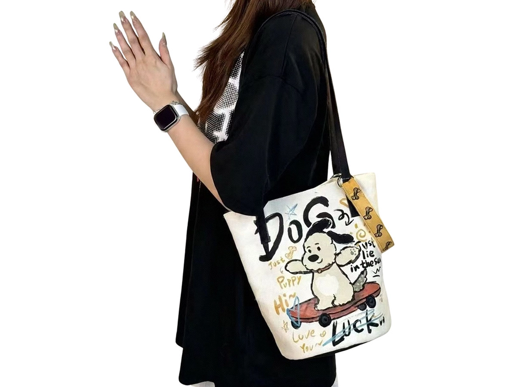 Dámská taška zdobená potiskem pejska z obou stran  je skvělým doplňkem pro každodenní nošení. Disponuje dvojitou rukojetí a spodní kruhovou částí v černé barvě, které zajišťují pohodlné nošení přes rameno a vyztužené kruhové dno, které drží tvar tašky. Uvnitř kabelky najdete pevnou podšívku světlé barvy s otevřenou boční kapsičkou pro snadný přístup k drobnostem, popruh se dvěma zapínacími kovovými kroužky, který vám poslouží jako klíčenka a hlavní prostor pro bezpečné uložení potřebných věcí se zapínáním na magnet. Praktická, lehká a stylová taška je ideální na výlety nebo každodenní nošení v létě i celoročně.