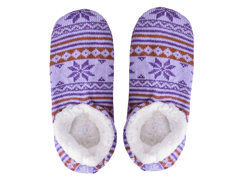Hledáte fialové ponožky a hřejivý materiál? Zahřejte své nohy ve vlně a měkoučkém beránku a dopřejte jim tak pohodlí i tepelný komfort. Potěší vás krásné severské vzory v kombinaci jemného bílého beránku. Teplé ponožky jsou praktické nejen díky hřejivosti, ale oceníte také protiskluzový povrch, který zajistí vaše bezpečí proti uklouznutí. Materiál ponožek se přizpůsobí šíři chodidla, neškrtí a poskytne tak požadované pohodlí. Stačí si jen zvolit správnou velikost.