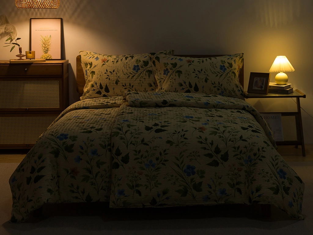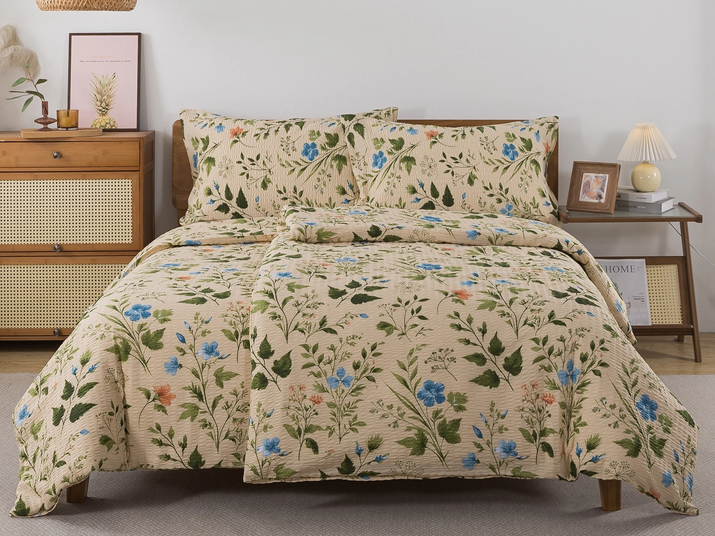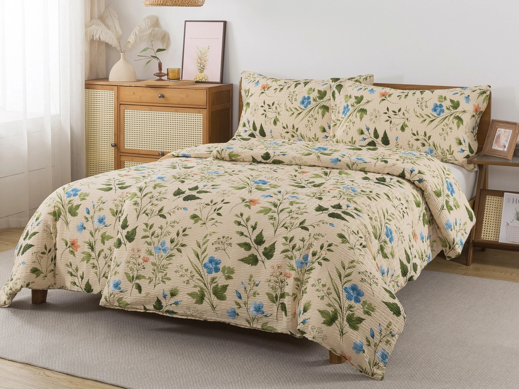 Oživte svou ložnici jemným dotekem letní přírody. Krepové povlečení s béžovým podkladem a elegantními modrými květy přináší svěží atmosféru a lehkost do přírodně laděného i venkovského interiéru. Vzdušná bavlna se zvrásněnou krepovou úpravou je ideální volbou pro teplé letní noci – je prodyšná, příjemná na dotek a šetrná k pokožce. Povlečení je vyrobeno ze 100% bavlny s krepovou strukturou, která se snadno udržuje a nevyžaduje žehlení. Praktické zapínání na zip zajišťuje rychlé a pohodlné převlékání.