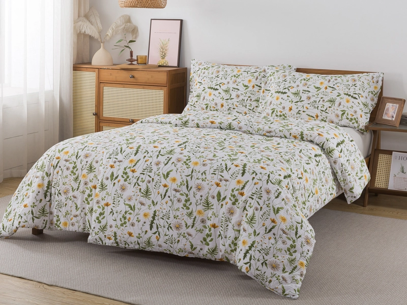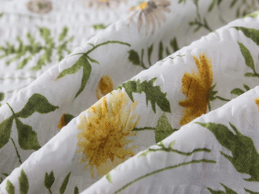Krepové povlečení s jemným vzorem pampelišek v zelených a žlutých tónech na bílém podkladu vnese do ložnice svěží jarní i letní atmosféru. Přírodní motiv působí lehce, vzdušně a dodá interiéru pocit čistoty a klidu. Povlečení je vyrobeno ze 100% bavlny s krepovou úpravou, která je příjemná na dotek, prodyšná a dobře odvádí vlhkost. Velkou výhodou je nenáročná údržba bez žehlení a vysoká odolnost materiálu vůči praní. Zapínání na zip zajišťuje pohodlné a rychlé převlékání.