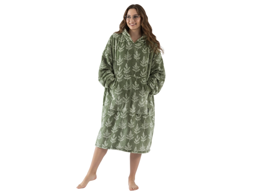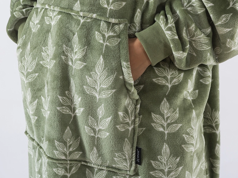 Mikinové deky s beránkem a vzor ROSTLINY jsou nejen velmi měkké a pohodlné na dotek, co je činí oblíbenými při relaxaci po celý den, ale potěší s rostlinným dezénem mikroplyše v barvě olivové a huňatým bílým beránkem i na oko. Deka s rukávy a kapucí vás příjemně zahřeje vrstvou mikroplyše, a to klidně u televize, při čtení knížky, nebo stejně jako