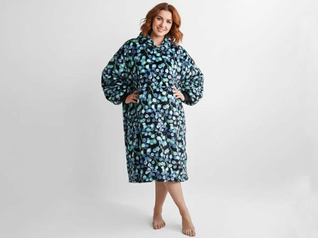 Mikinové deky a vzor eukalyptu v černo-modré barvě jsou ideální jako domácí oblečení při relaxaci i při oblíbených činnostech po celý den. Deka s rukávy a kapucí vás příjemně zahřeje vrstvou mikroplyše, navíc je komfortní i svým rozměrem. Využití najde například u televize, při čtení knížky, nebo stejně jako mikroplyšová deka, tak i teplá mikina dobře poslouží na terase či balkóně za chladného počasí. Tato oversize mikinaUNI velikost (rozměry viz fotografie) a dopřeje pohodlí jak pro ženy, tak i pro muže. Jsou velmi lehké i skladné, a tak si je můžete přibalit společně se županem a mít pohodlí i na dovolené či na chatě. A údržba? Mikinové deky stačí vyprat, vysušit klidně i s použitím sušičky na jemný program s nižší teplotou a opět se můžete zachumlat do teploučka.