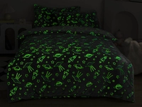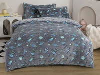 Dopřejte svému dítku to nejjemnější pohlazení jako od plyšáka. Hvězdy, planétky i kosmické rakety v v efektní modré a zelené barvě krásně vinikají na světle šedé v podkladu. Navíc se s obrázky malý dobrodruh nemusí rozloučit po zhasnutí světla! Obrysy vzorů ve tmě krásně svítí a společně s hřejivým objetím, jemností a měkkostí mikroplyše pomůžou děťátku s usínáním. Navíc oceníte, že mikroplyšové povlečení nepouští chloupky, nežmolkuje, je stálobarevné a rychle schne.