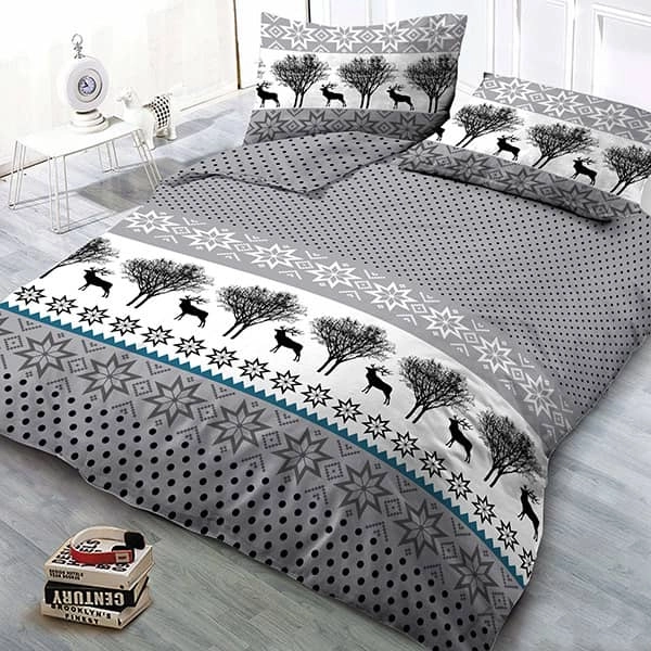 Flanelové povlečení OLENA s decentním a zároveň svěžím motivem jelenů, vánočních hvězd a nadčasových teček vkusně sladěných na decentním šedém podkladu, je jako stvořené pro zimní období či vánoční čas. Turecká 100% bavlna nabídne vlákno s dobrou absorpcí, prodyšností a hebkostí na dotek.