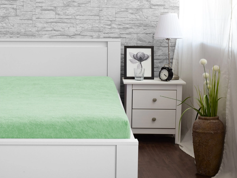 K hezkému povlečení bezpochyby patří vkusně sladěná froté prostěradla. Tvoří je hřejivá, měkká a na dotek příjemná smyčková tkanina, která se skládá z 80 % bavlny a 20 % polyesteru. Zelené froté prostěradlo v ložnici podtrhne přírodní styl a společně s povlečením i povlaky na polštářky vkusně doladí každý interiér. Snadno si je oblíbíte pro jejich nenáročnou údržbu bez žehlení. Spodní část prostěradla je zakončena všitou gumou, díky níž se lehce upevní na matraci a dobře na ní drží.