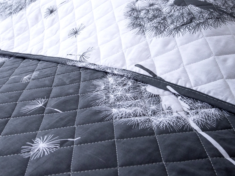 Decentní motiv odkvetlých pampelišek a poletujícího chmýří doladí vaší ložnici k dokonalosti. Přehozy na postel poskytnou nejen estetický doplněk, ale i praktické vlastnosti. Prošívaný přehoz PAMPELIŠKY na manželskou postel je zhotoven ve dvojí barevnosti, obdobně jako povlečení v DUO provedení. Můžete jej měnit pouhým otočením každý den podle nálady či ročního období. Na léto se hodí bílý podklad s šedým potiskem a v zimních měsících tmavě šedý základ s bílým vzorem.