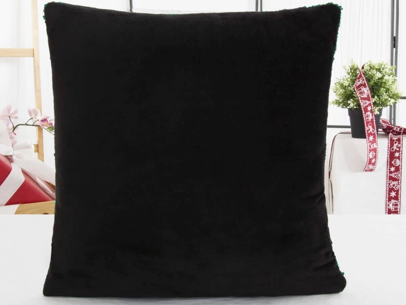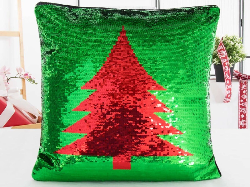 Díky rafinovaně našitým flitrům na něm najdete dva měnící se designy. Přední stranu zdobí stromek na zeleném podkladě a pouhým přejetím ruky po povrchu se design změní na zelený stromek na červeném pozadí. Zadní stranu povlaku na polštář tvoří jednobarevný černý mikroplyš s krátkým chloupkem jemným jako samet.