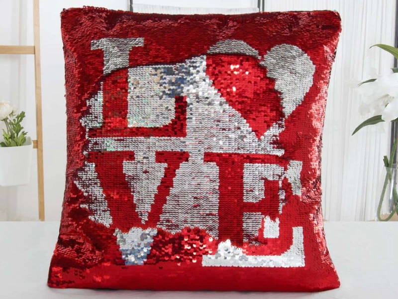 Krásně projasní každý všední den a chytí za srdce. Díky všitým flitrům nabízí rovnou dva měnící se designy. Vrchní stranu stříbrného nápisu LOVE na červeném podkladu změnite lehce přejetím jedné ruky na čevený nápis se stříbrným pozadím. Zadní stranu povlaku tvoří jednobarevný černý mikroplyš s krátkým chloupkem jemným jako samet.