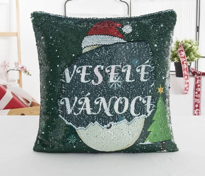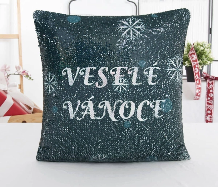 Díky rafinovaně našitým flitrům na něm najdete dva měnící se designy. Na přední straně se na vás usměje veselý sněhulák na zeleném podkladu a pouhým přejetím ruky po povrchu se objeví nápis VESELÉ VÁNOCE. Zadní stranu povlaku tvoří jednobarevný mikroplyš s krátkým chloupkem jemným jako samet. A Vánoce můžou začít!
