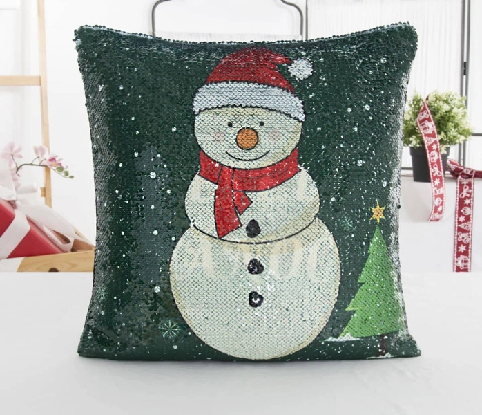 Vánoční flitrový povlak s motivem sněhuláka bude hravým doplňkem vašeho domova.