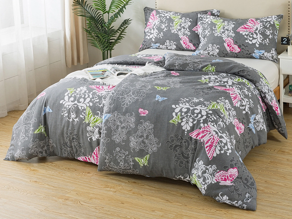 Povlečení DENISA s jemným vzorem motýlků potěší především romantiky. Rafinovaný podklad v šedé barvě nechá krásně vyniknout bílé i barevné vzory a s přehledem zaujmou v ložnici či pokojíku na první pohled. Materiál ze 100% bavlny přináší dobré absorpční vlastnosti, dlouhou životnost a na omak hebký povrch. A ve dne nezapomeňte na přehoz na manželskou postel, který vaše lůžkoviny dokonale ochrání. Využijte výhodný set 2+2 na dvě klasická lůžka.