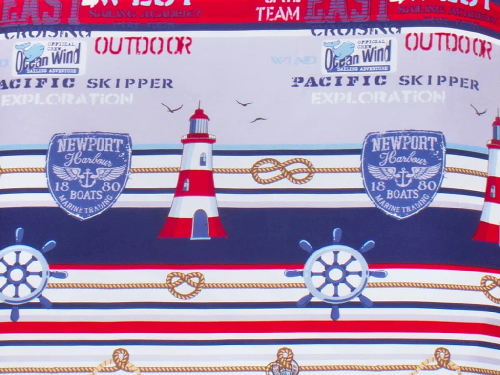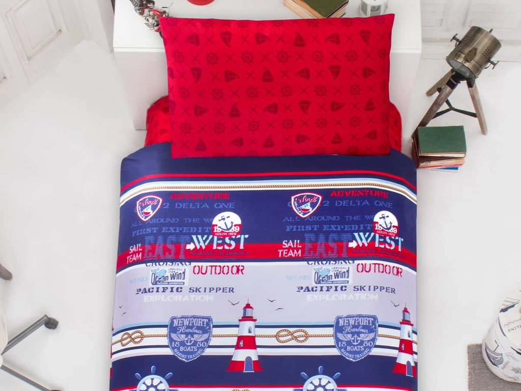 Námořnícky styl ROTA vnese hravě do každého pokoje mořskou tématiku. Příhodné syté barvy červená, modrá, bílá ztvárňují například kormidlo, kotvu, maják a jiné symboly plavidla či přístavu a to z obou stran povlaku na přikrývku, (povlak na polštář je červeno modrý viz obrázek). Oceníte příjemnou hladkou bavlnu, která dobře drží tvar i barevnost.