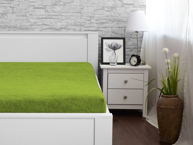 K hezkému povlečení bezpochyby patří vkusně sladěná froté prostěradla. Tvoří je hřejivá, měkká a na dotek příjemná smyčková tkanina, která se skládá z 80 % bavlny a 20 % polyesteru. Zelené froté prostěradlo v ložnici podtrhne přírodní styl a společně s povlečením i povlaky na polštářky vkusně doladí každý interiér. Snadno si je oblíbíte pro jejich nenáročnou údržbu bez žehlení. Spodní část prostěradla je zakončena všitou gumou, díky níž se lehce upevní na matraci a dobře na ní drží.