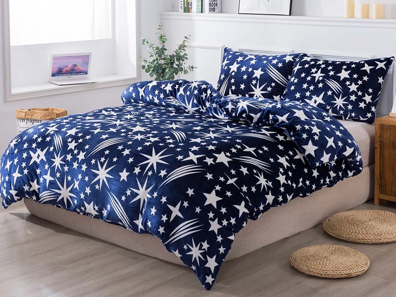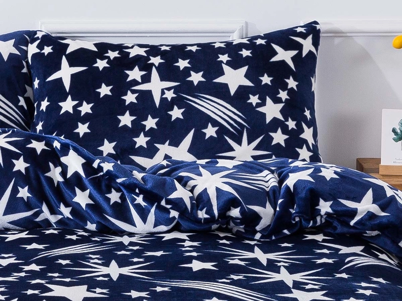 Modré plyšové povlečení a hvězdy pro spánek v hřejivém objetí noční oblohy