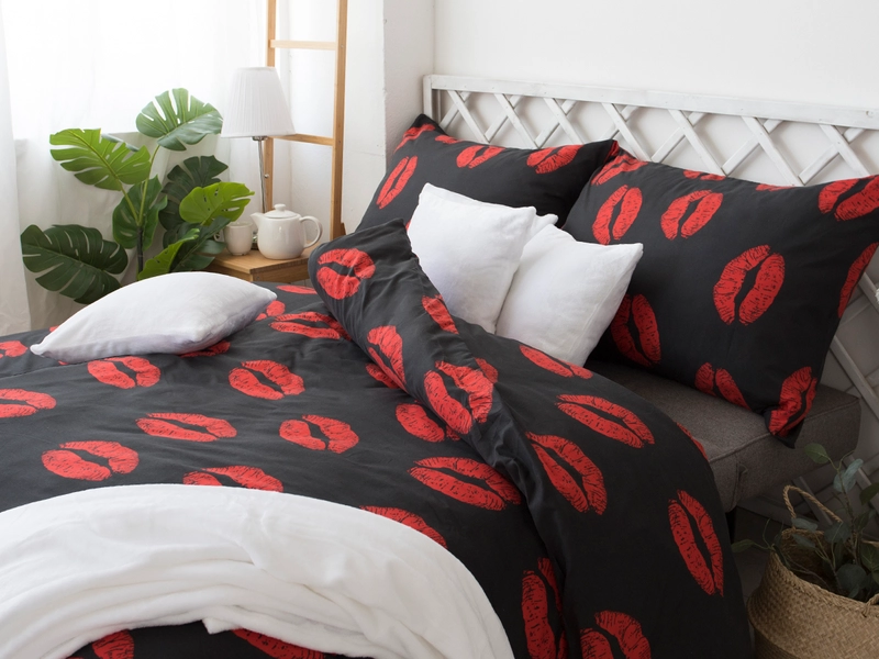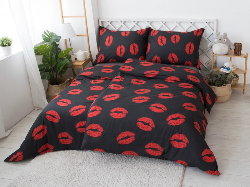 Moderní mikrosaténové povlečení KISS se snadno stane ozdobou ložnic či dívčích pokojů. Romantický dojem umocňuje příhodná kombinace barev černé v podkladu s červeným otiskem rtů. Atraktivní design však není to jediné, čím toto ložní prádlo dokáže zaujmout. Za zmínku stojí také extrémně jemný a savý materiál, který rychle schne, je odolný a dobře drží barvy.