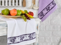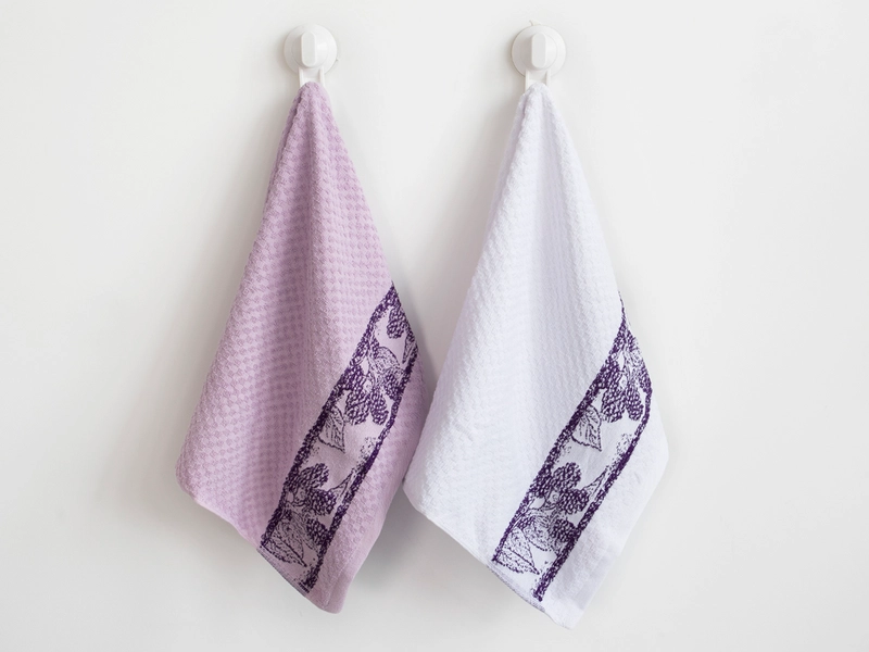 Vysoce savé kuchyňské utěrky, nebo ručníky jsou v domácnosti nepostradatelným pomocníkem. Měkká nadýchaná bavlna pohladí vaše ruce a zpříjemní tak úklid kuchyně, nezanechává vlákna a díky univerzálnímu dezénu poslouží i jako ručník ve vaši koupelně. Kuchyňské utěrky zdobí líbivý dekor fialové výšivky BLACKBERRY ve spodní části, jenž efektně doplňuje buď světle fialové, nebo bílé přerušované froté tvořící drobný vzor šachovnice z obou stran.