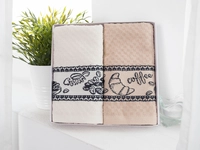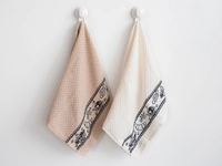 Vysoce savé froté utěrky jsou v domácnosti nepostradatelným pomocníkem. Měkká nadýchaná bavlna pohladí vaše ruce a zpříjemní tak úklid linky i jídelního stolu, krásně vysuší nádobí a nezanechají na něm žádné vlákna. Kuchyňské utěrky zdobí líbivý dekor tmavě hnědé výšivky COFFEE ve spodní části, jenž efektně doplňuje buď béžové, nebo světle krémové přerušované froté tvořící drobný vzor šachovnice z obou stran.