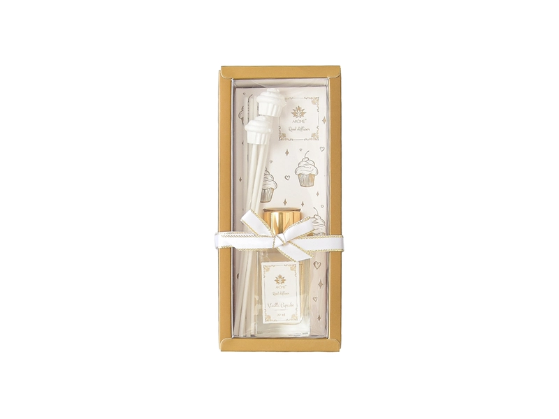 Aroma tyčinkový difuzér s lahodnou vůni vanilky a koláčků příjemně provaní váš domov. Osvěžovač vzduchu Vanilla Cupcake potěší nejen doma, ale všude tam kde se potřebujete cítit příjemně. Dárková krabička se stužkou obsahuje hranatou lahvičku, 2 ks tyčinek s jílovou dekorací a 4 tyčinky. Potěší nejen vás, ale i jako krásný a voňavý dárek pro vaše blízké.