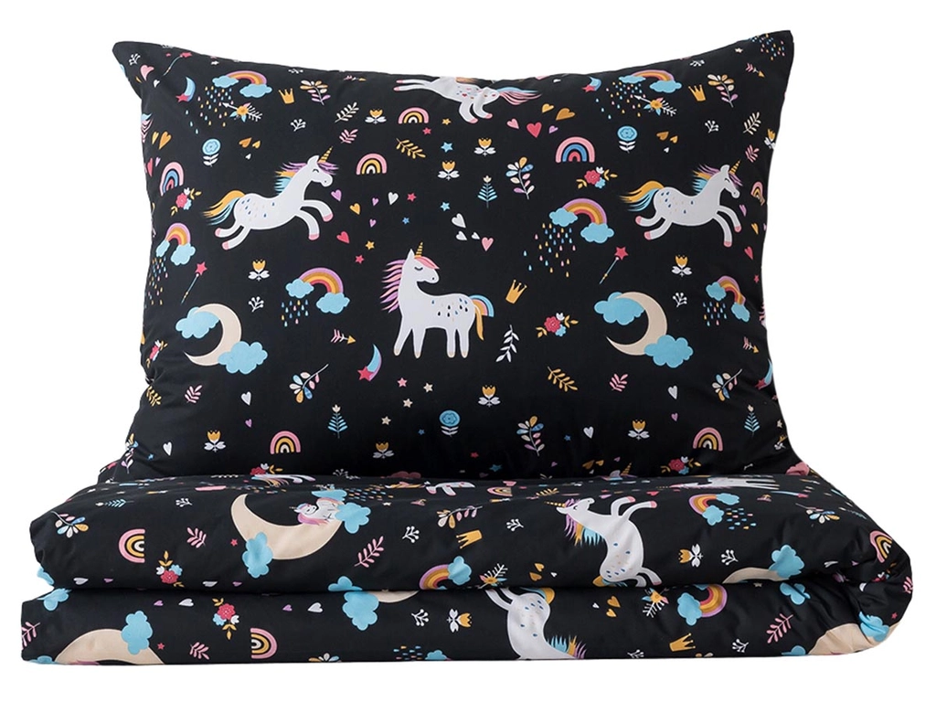 Dopřejte svému děťátku sladké sny v kouzelném světě jednorožců! Povlečení JEDNOROŽCI je vyrobeno z kvalitní 100% bavlny, která je jemná na dotek, prodyšná a příjemná k dětské pokožce. Povlečení je oboustranné – z jedné strany zdobí látku roztomilí jednorožci na černé v podkladu, z druhé strany pak stejný motiv na bílém podkladu, díky čemuž můžete snadno měnit vzhled postýlky podle nálady.