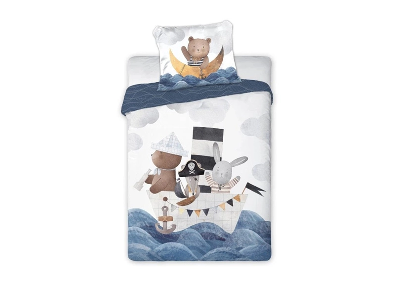 Roztomilé povlečení LOĎ pro malé mořeplavce. V postýlce se bude povlečení pro děti vyjímat s potlačí, kde usměvavý medvídek a jeho parta pirátů na loďce obklopené modrými vlnkami a mořským motivem pluje za klidnou atmosférou vhodnou pro dětský spánek. Povlečení 135x100 je vyrobeno ze 100% bavlny, která je měkká, prodyšná a šetrná k citlivé dětské pokožce. Díky praktickému zapínání na knoflíky se dětské povlečení snadno povléká i svléká před praním.