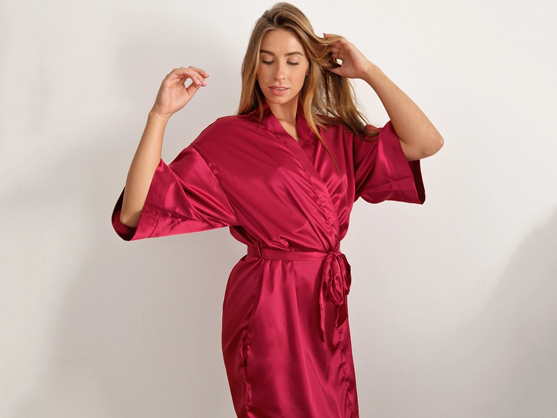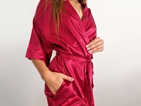 Dámský saténový župan okouzlí luxusním vzhledem v barvě červené a pohladí hedvábnou jemností. Elegantní vzhled, lehký materiál a praktický střih tříčtvrtečních rukávů nabízí vše pro dokonalou pohodu i romantickou atmosféru. Saténové kimono jednoduše zavážete dvojím vázáním a můžete si vychutnat svou oblíbenou kávu na terase. Stačí si jen vybrat z pestré nabídky barev.