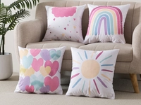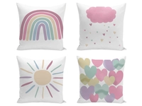 Jak nenáročně a efektně doladt dětský pokojík? V detailu je síla! Povlak na polštářek 43x43 je se vzorem duhy, mráčků, sluníčka a srdíček s akcentem růžové to pravé pro pokojík vašich ratolestí. Povlak na polštář, kvalitní potisk a výhodný set 4ks bude ideálním doplňkem dětského textilu. Příjemný a odolný materiál a pastelové barvy potisku vás osloví odolností i kvalitním zpracováním, rozměrem sedí na polštář 40x40 díky tomu jsou tyto dekorativní povlaky na polštářky oblíbené nejen pro dekoraci, ale i pro odpočinek malých slečen.