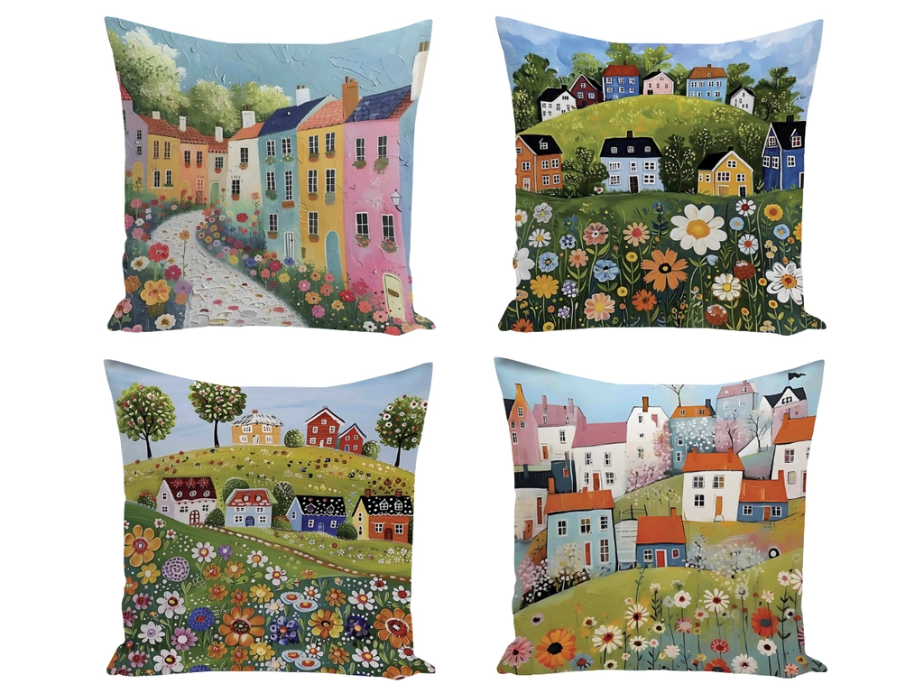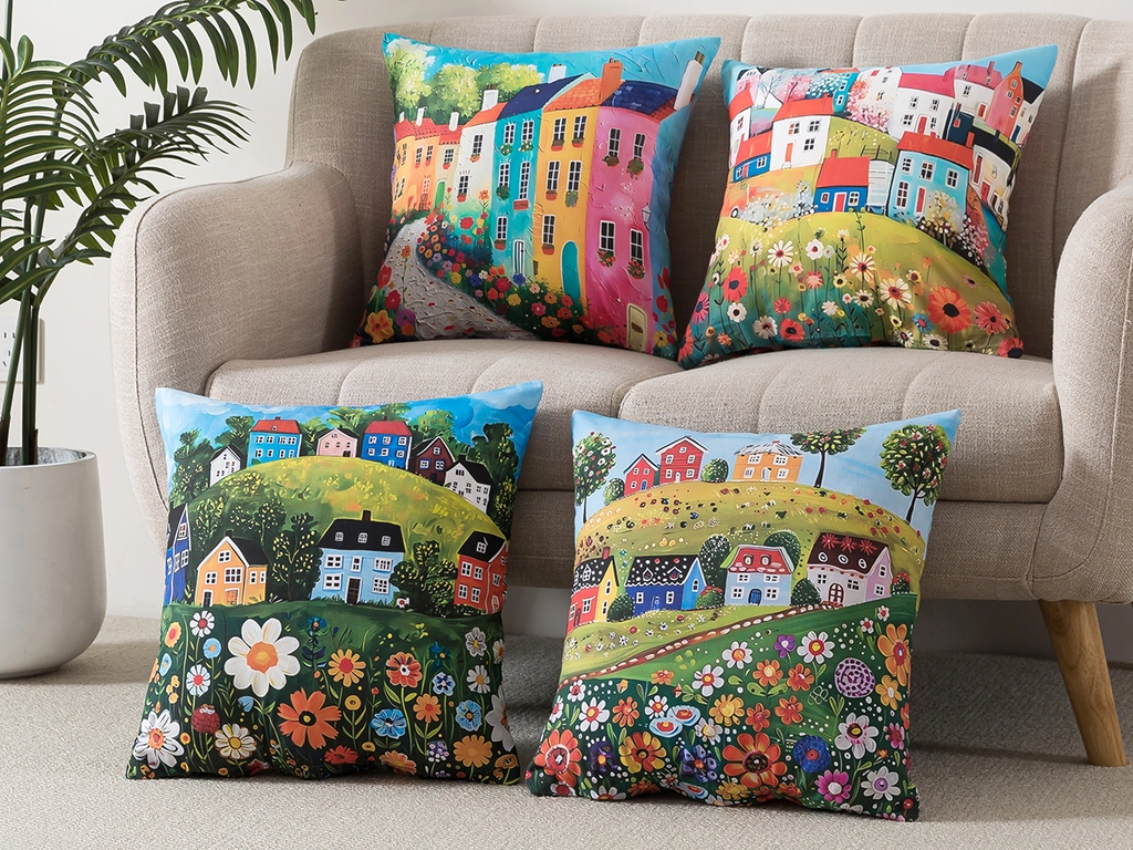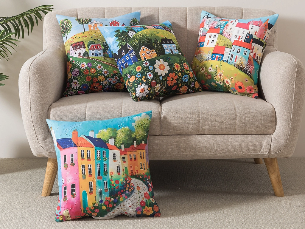 Barevné povlaky na polštářky a vzor domečků pro letní období