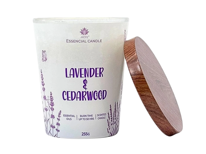 Vytvořte si doma klidnou a vyrovnanou atmosféru s esenciální svíčkou AROME s objemem 255g. Levandulová svíčka je vyrobená z kvalitních esenciálních olejů naplněných do skla s designovým obalem květin levandule a kovovým víčkem s dekorem dřeva, které zachovává vůni i kvalitu vosku.